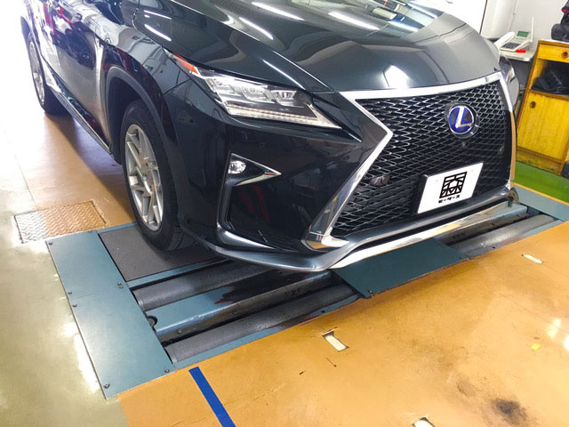 ここでは排気ガステスターにて排気ガスの測定をします。写真はガソリン車なのでプローブという管をマフラーに挿入し、CO(一酸化炭素)、HC(炭化水素)を測定します。ディーゼル車には別の測定器でディーゼルエンジンから排出される黒煙・粒子状物質を測定し、全て基準値を外れると車検が通りません。