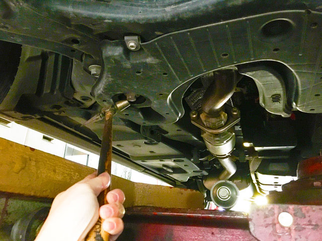 ここでは自動車検査員が車の下回りの取付け締付け状態を点検ハンマーなどで確認します。